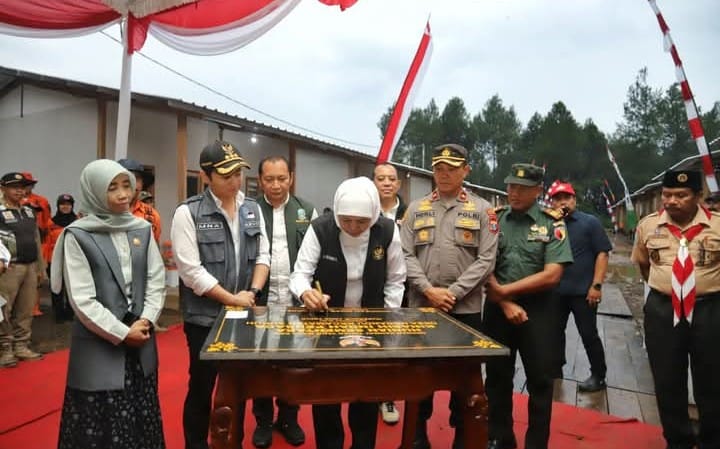 Hunian Sementara (Huntara) di Desa Ngrandu Kecamatan Suruh diresmikan oleh Gubernur Jawa Timur Khofifah Indar Parawansa saat kunjungannya ke Kabupaten Trenggalek, Kamis (4/12/2025).