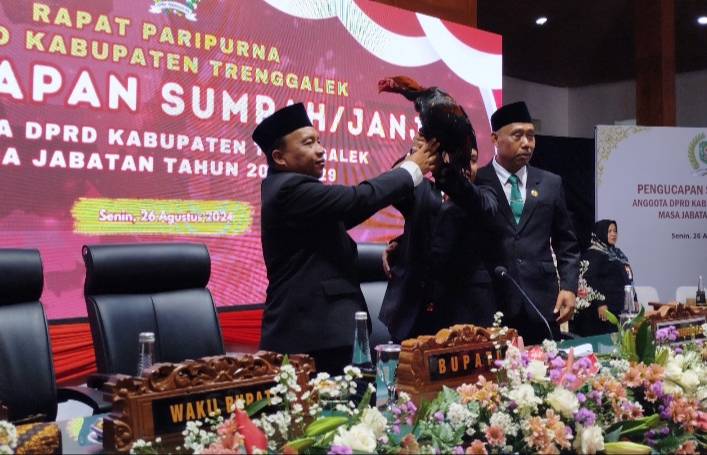 Dia bukan mengucapkan selamat atau mengajak foto anggota DPRD Trenggalek yang baru dilantik, melainkan dengan membawa ayam jago. Ayam tersebut ternyata diberikan kepada pimpinan sementara DPRD Trenggalek.