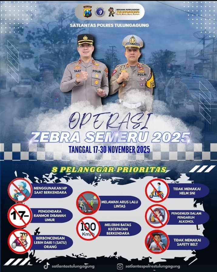 Tulungagung indonesiatodays.net. Satlantas Polres Tulungagung mulai menggelar Operasi Zebra Semeru 2025 pada 17–30 November 2025. Operasi ini dilaksanakan serentak di seluruh Jawa Timur sebagai upaya meningkatkan budaya tertib berlalu lintas.